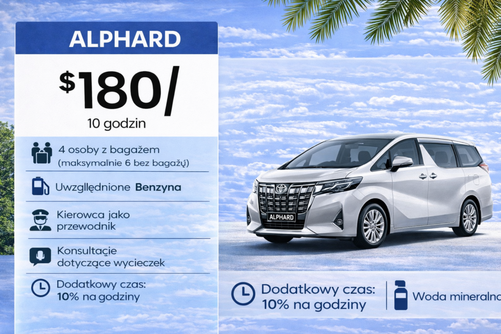 Toyota Alphard to samochód klasy premium, wybierany przez osoby, które oczekują maksymalnego komfortu, elegancji i spokojnej jazdy po Bali. Doskonale sprawdza się zarówno podczas transferów lotniskowych, jak i całodziennych przejazdów, spotkań biznesowych czy prywatnych wycieczek w bardziej ekskluzywnym stylu.