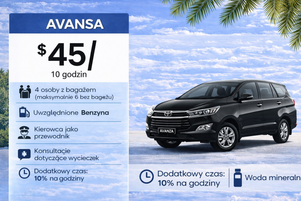 Toyota Avanza to jeden z najczęściej wybieranych samochodów do prywatnych przejazdów i transferów na Bali. Sprawdza się idealnie zarówno podczas krótszych transferów, jak i całodziennych przejazdów po wyspie, oferując dobrą równowagę pomiędzy komfortem, funkcjonalnością i ceną. Avanza to auto kompaktowe, ale przestronne – dobrze radzi sobie zarówno w mieście, jak i na dłuższych trasach prowadzących do popularnych atrakcji Bali. Dzięki wysokiej pozycji siedzenia zapewnia dobrą widoczność, a klimatyzowane wnętrze gwarantuje komfort nawet podczas dłuższych przejazdów w tropikalnym klimacie.