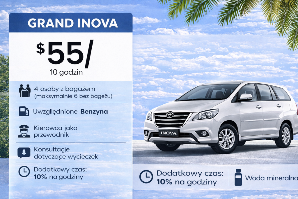 Toyota Grand Innova to wygodny i solidny samochód klasy wyższej, bardzo ceniony na Bali podczas prywatnych przejazdów, transferów oraz całodziennych wycieczek po wyspie. Jest chętnie wybierana przez osoby, które oczekują większego komfortu podróżowania, stabilności na trasie i przestronnego wnętrza, szczególnie przy dłuższych dystansach.Grand Innova doskonale sprawdza się zarówno w ruchu miejskim, jak i na trasach prowadzących do bardziej oddalonych atrakcji Bali, takich jak Ubud, północ wyspy czy wschodnie wybrzeże. Przestronna kabina, wygodne siedzenia i dobra izolacja od hałasu.
