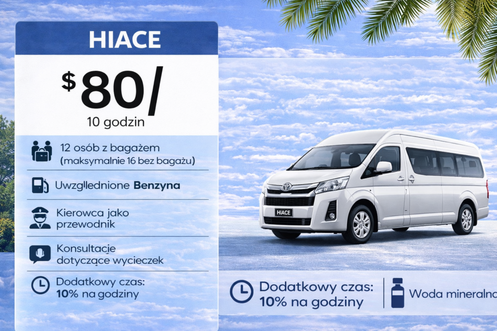 Toyota Hiace to doskonały wybór dla większych grup podróżujących po Bali, które chcą poruszać się razem w komfortowych i bezpiecznych warunkach. Ten model jest szczególnie ceniony przy transferach lotniskowych, wycieczkach objazdowych oraz całodziennych przejazdach po wyspie, gdzie liczy się przestrzeń i wygoda.
