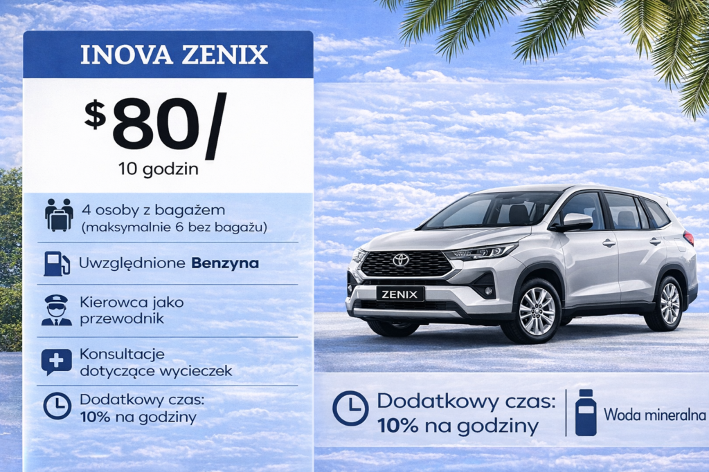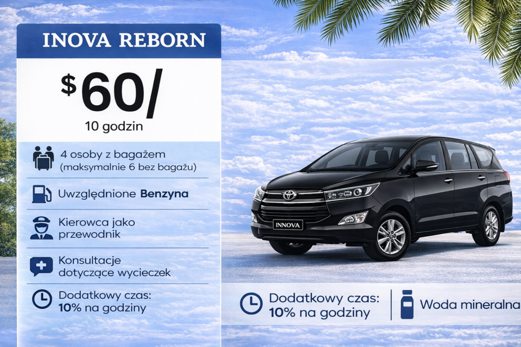 Innova Reborn oferuje przestronne, klimatyzowane wnętrze oraz bardzo dobrą jakość prowadzenia, dzięki czemu podróż po wyspie jest spokojna i przyjemna nawet przy intensywnym ruchu drogowym.